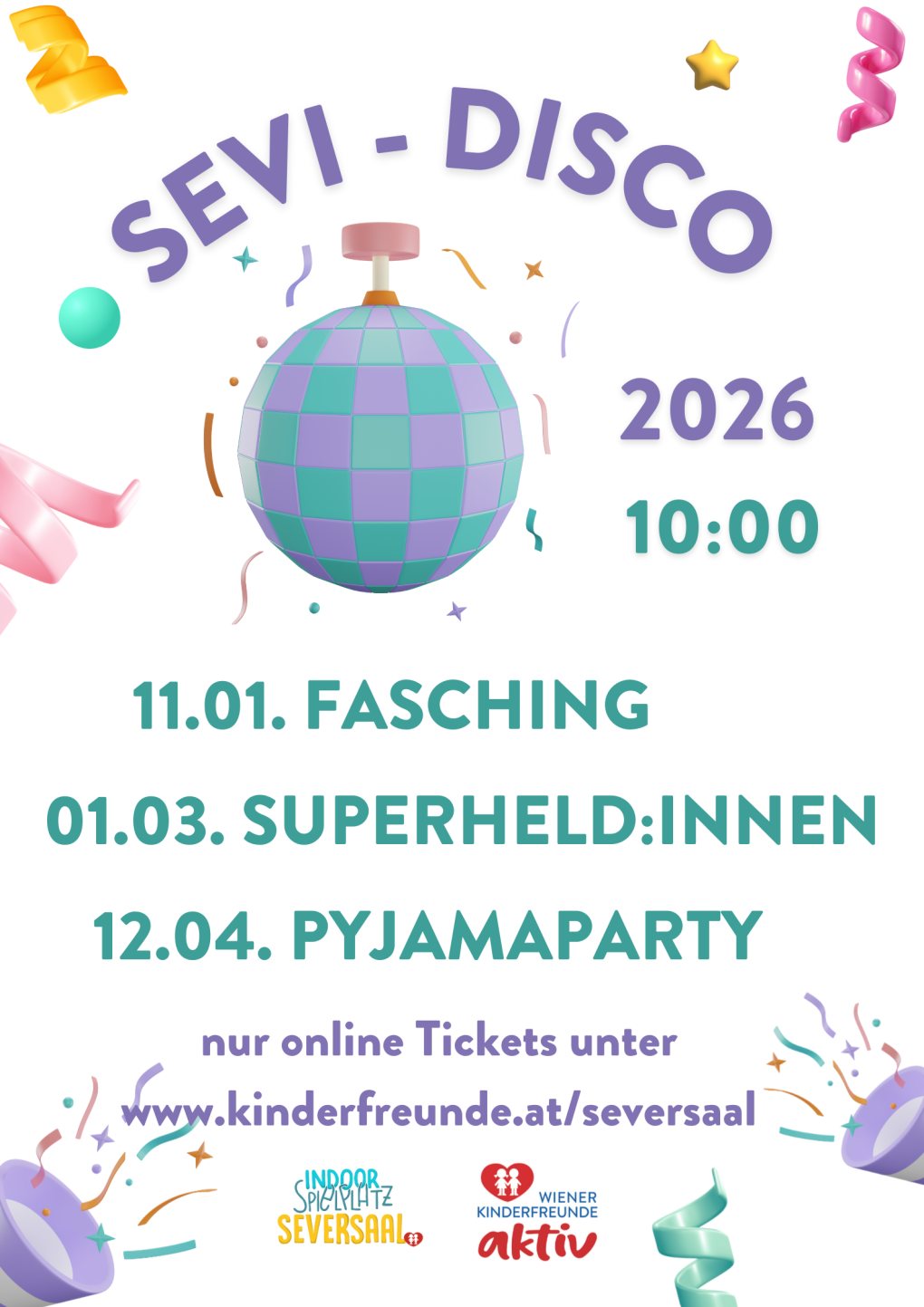 - Sonntag, 01.03.2026 von 10:00 bis 12:30 Uhr: Sevi-Disco Thema "Superheld:innen". Tickets bitte vorher hier online buchen!