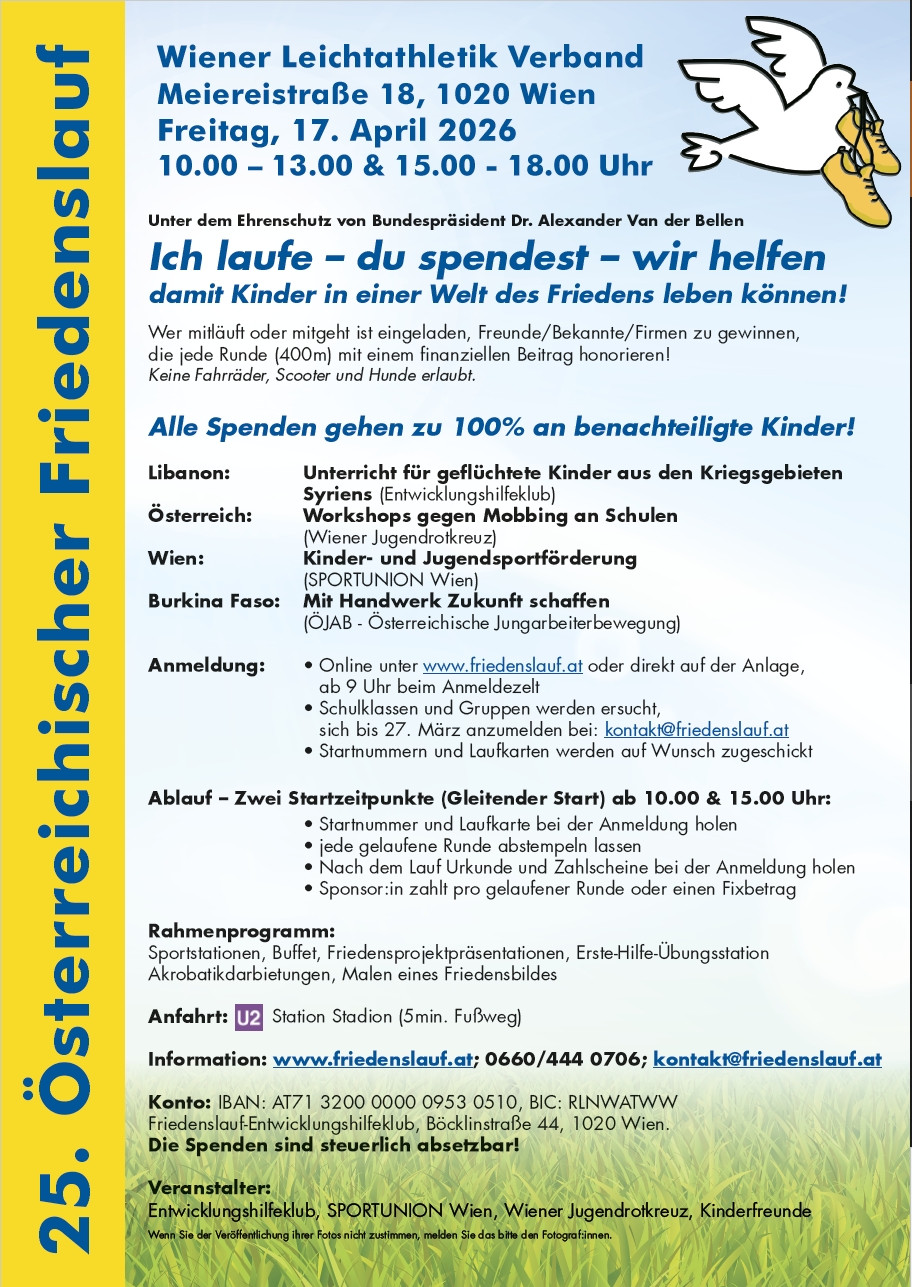 Unser Spielbus wird auch heuer wieder beim 25. Österreichischen Friedenslauf dabei sein. Unter dem Motto „ICH LAUFE – DU SPENDEST – WIR HELFEN“ wird unter dem Ehrenschutz des Bundespräsidenten von vielen Kindern, Jugendlichen und Erwachsenen ein laufender Beitrag für verschiedene Projekte geleistet, damit Kinder in einer Welt des Friedens leben können.